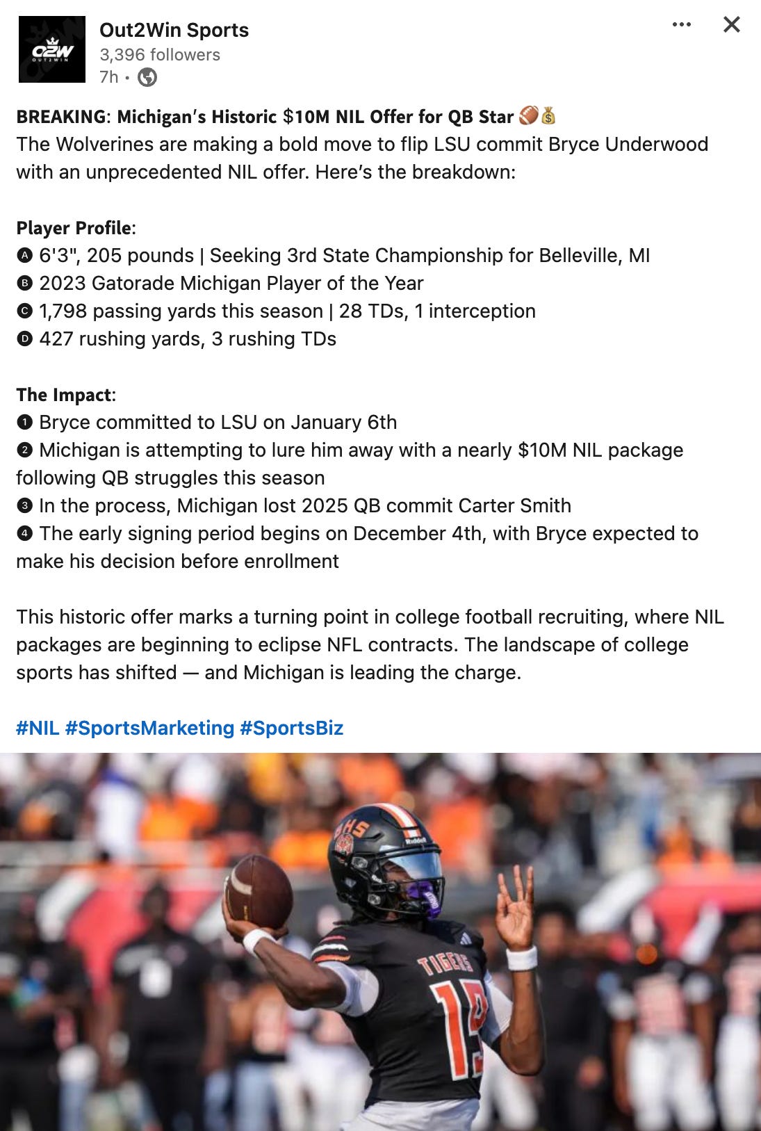 I was scrolling through LinkedIn the other night when I came across the above post from Out2Win Sports talking about this years top rated high school QB prospect, Bryce Underwood. For the time being, Underwood is committed to play football at LSU next season, but what would get in the way of that? The answer is simple-NIL